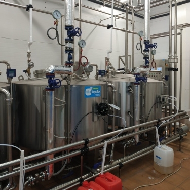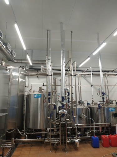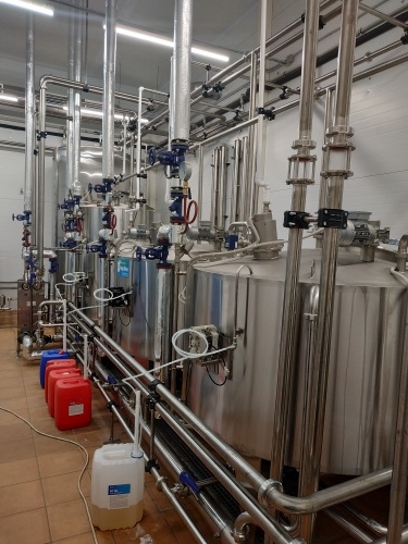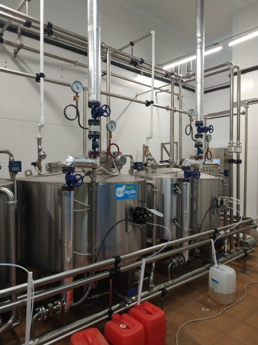 Циркуляционная CIP-мойка наименование по декларации ЦМ, предназначена для санитарной обработки технологических трубопроводов и емкостей и представляет собой набор отдельно стоящих емкостей различных объемов, объединенных между собой системой трубопроводов. Ёмкости изготовлены из н.ж стали и снабжены переливными патрубками. В систему входят следующие виды емкостей: ёмкость для наведения щелочного раствора, ёмкость для наведения кислотного раствора, ёмкость для наведения дезраствора (НУК), объем емкостей 1000 и 2000 л. Перемешивание происходит при помощи лопастной мешалки (18 об/мин), нагрев производится трубчатым паровым змеевиком, наполнение воды происходит через соленойд, управляемый электронным датчиком уровня. Ёмкости снабжены светодиодными светильниками, напряжением 24 В. Наведение заданной концентрации, происходит в автоматическом режиме, при помощи проточного прибора конценратомера.